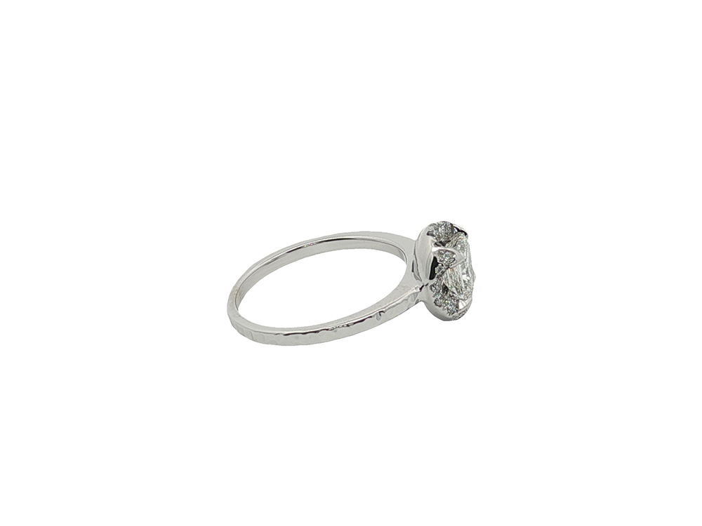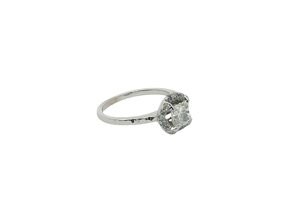 This is a bit of a unique contemporary engagement ring, mainly due to the texture it has courtesy of an undulating cushion-shaped halo and diamond-decked prongs on the center stone.