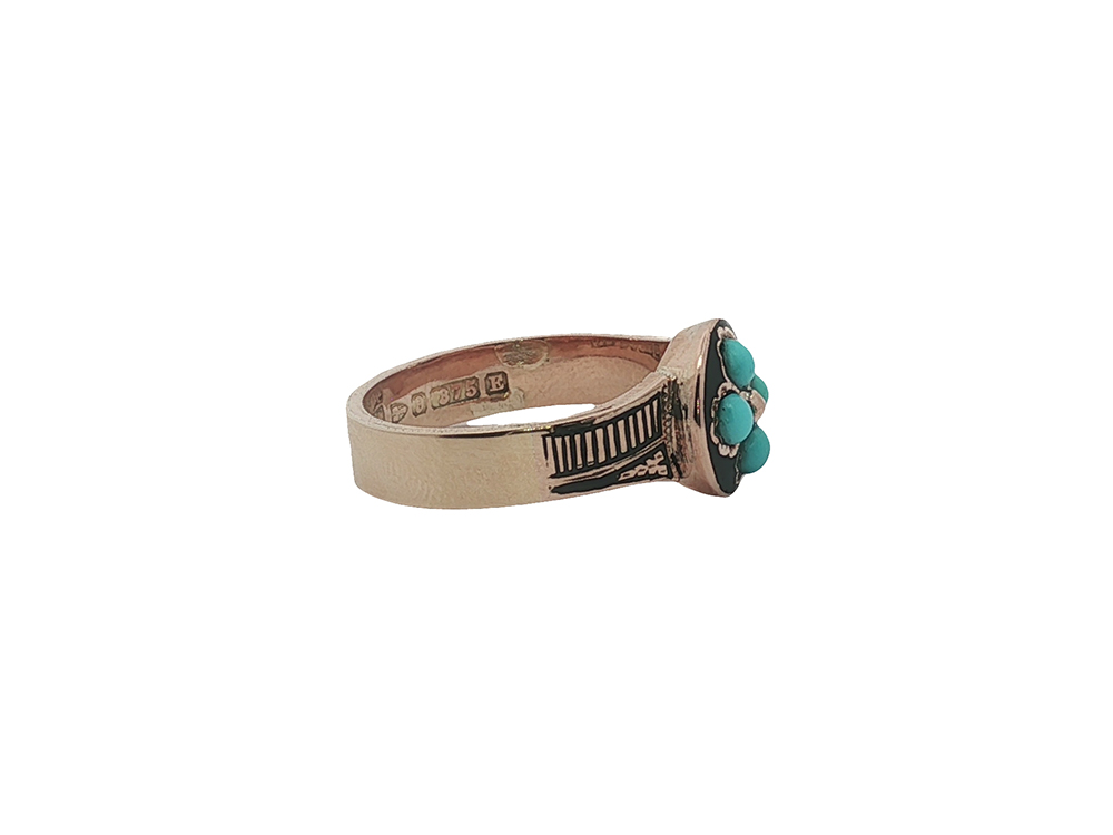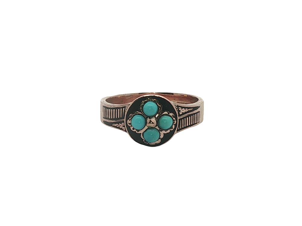 Livin’ for and lovin’ on this antique English-made ring. Exquisite enamel and turquoise in a robin’s egg hue take center stage here.
