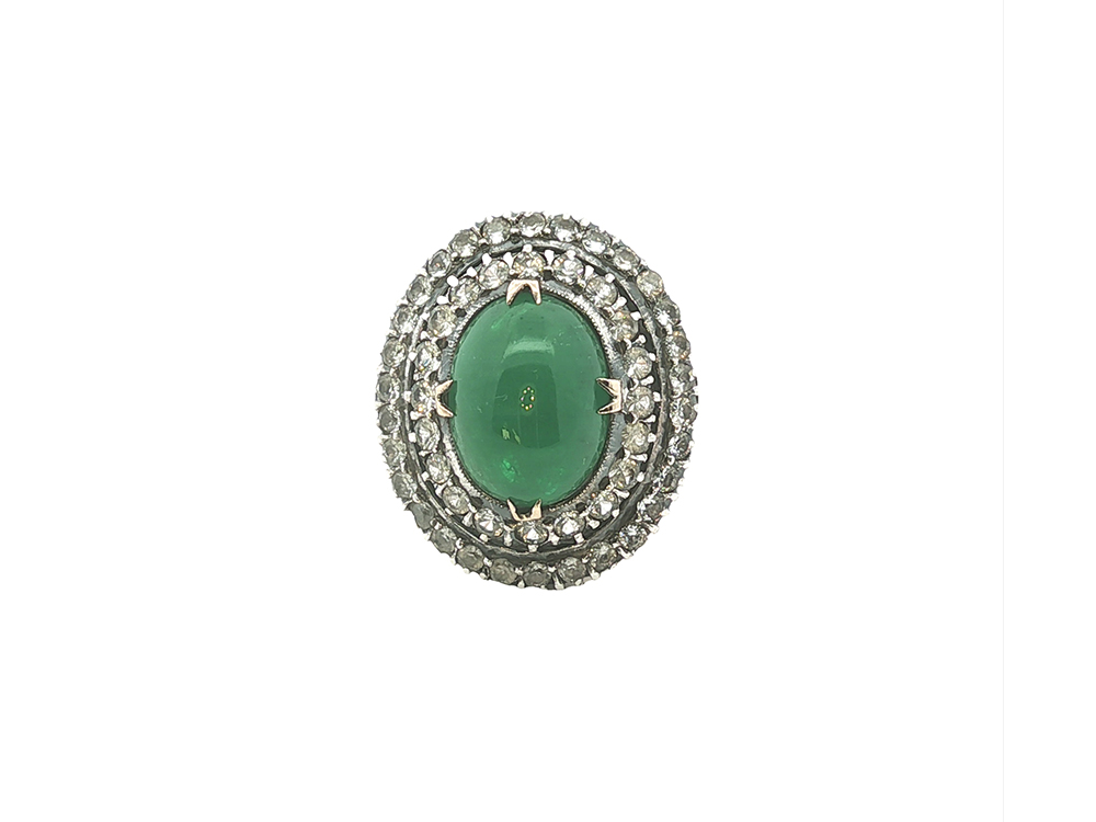 Stone(s): 14 x 10 mm emerald cabochon, round faceted white sapphires (approximately 1.44 carats)