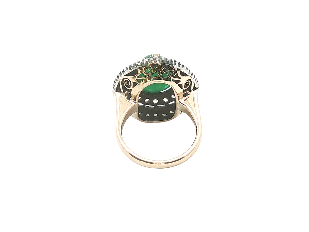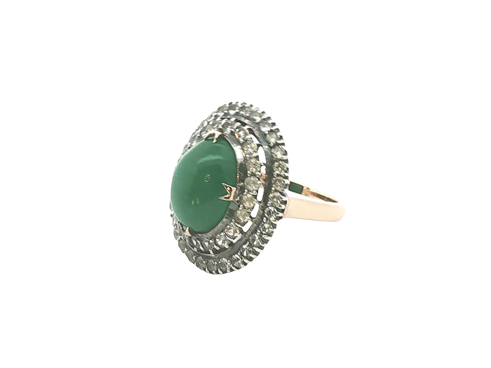 If you’re looking to have your ring go a long way for you, this 18k yellow gold and sterling silver topped beauty will do it. It features a 14 x 10 mm emerald cabochon center surrounded by a double halo of white sapphires.