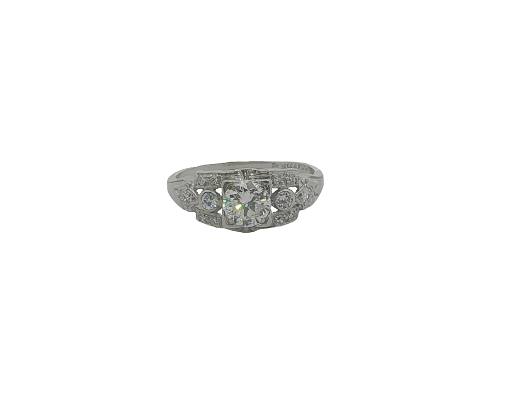 This is an attractive Deco-era engagement ring that offers a lot of bang for the buck. A 0.55 carat old European cut diamond is accented by an additional 1/5 of a carat of additional diamonds in a geometric setting.