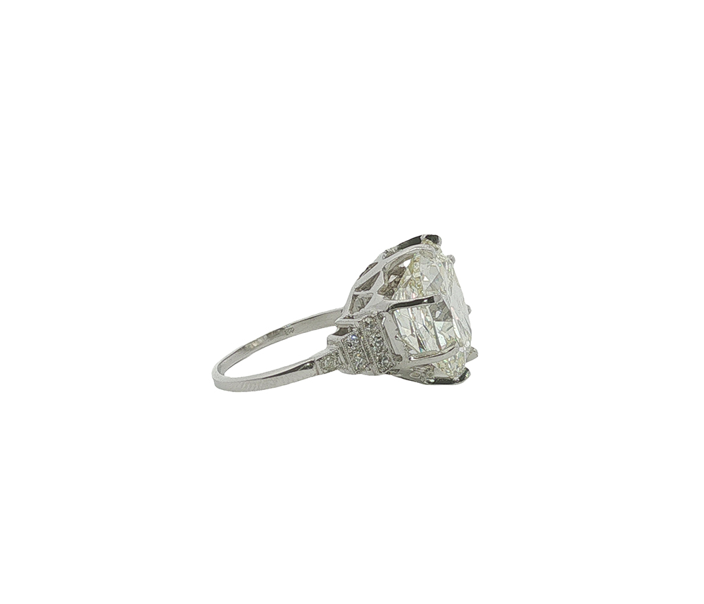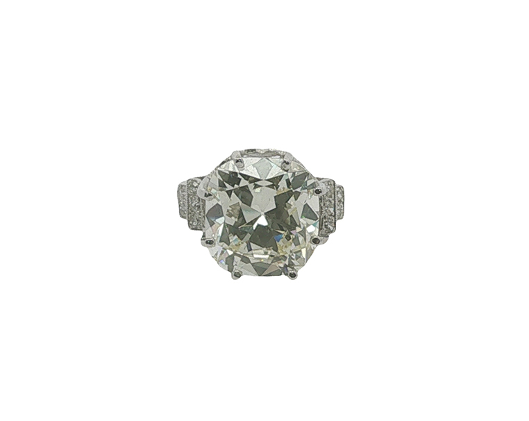 Stone(s): 10.13 ct old mine cushion cut (GIA Report 2231776019), twelve single cut diamonds (approximately 0.15 carats total)