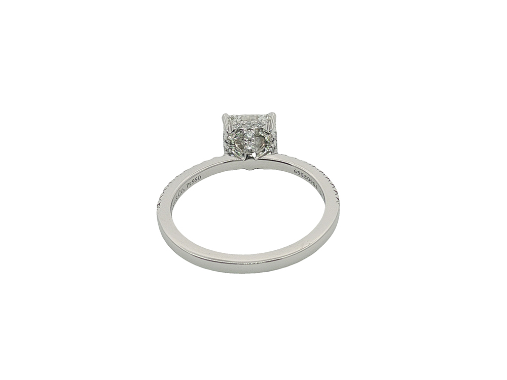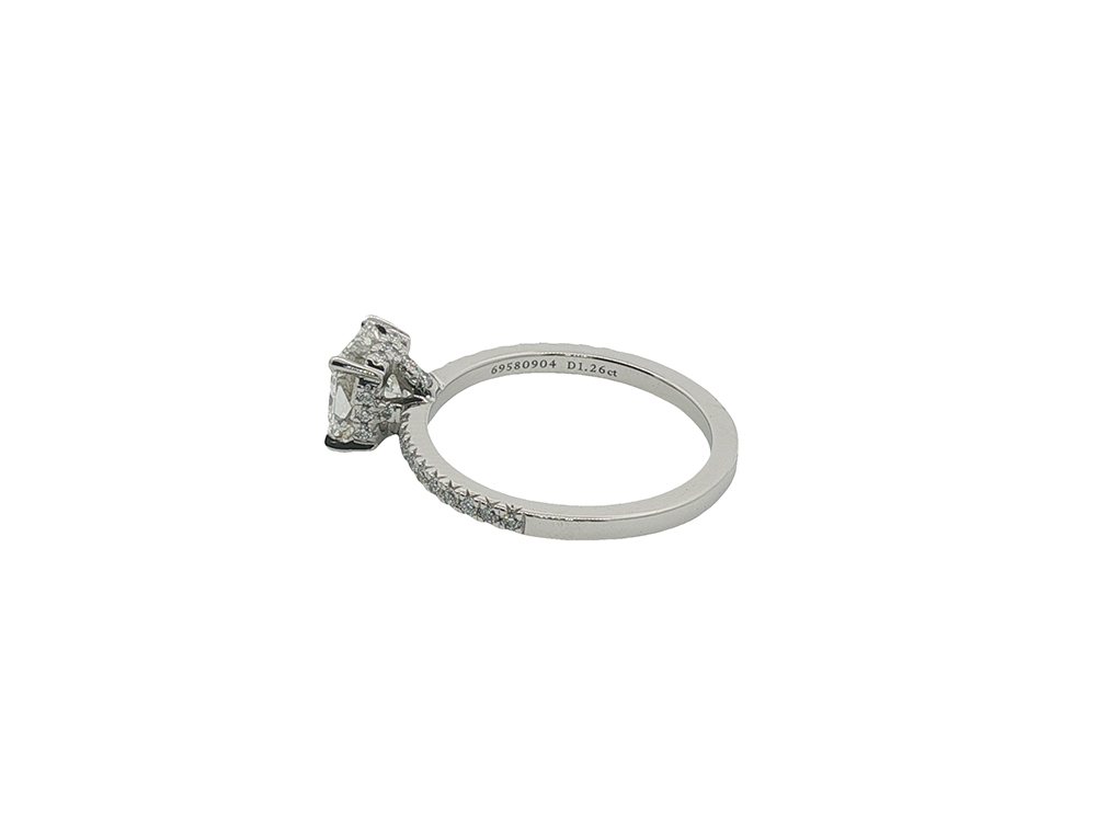 An absolutely gorgeous 1.26 carat cut-cornered square diamond of H color, VVS1 engages the eye in this classic platinum setting from Tiffany & Co. An additional 0.16 carats of internally flawless diamonds provide exceptional sparkle.