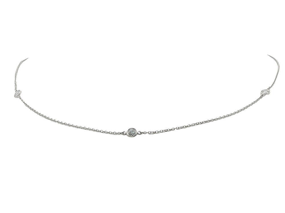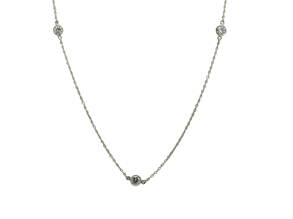 These Tiffany & Co. diamonds by the yard necklaces never stick around long, so come visit it soon! This version is crafted in platinum and features three bezel-set diamonds weighing a total of approximately 0.30 carats.