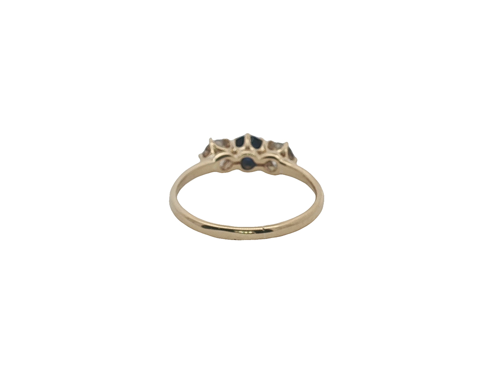 Stone(s): 3..5 mm sapphire cabochon, two round brilliant cut diamonds measuring approximately 3.00 mm