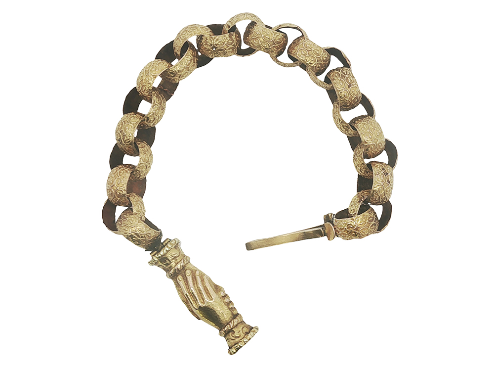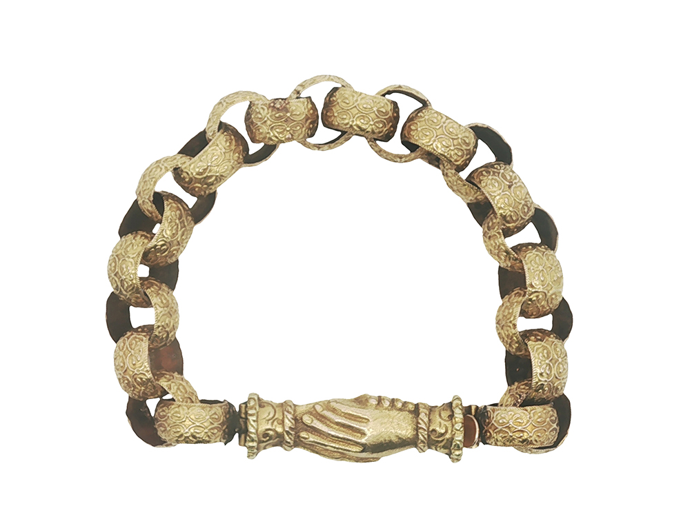 To say we’re jazzed over this bracelet would be an understatement. We’ve got to hand it to this one – a unique clasp comprised of two gripped palms with decorative cuffs and exquisitely detailed links make this 9k piece a store favorite.