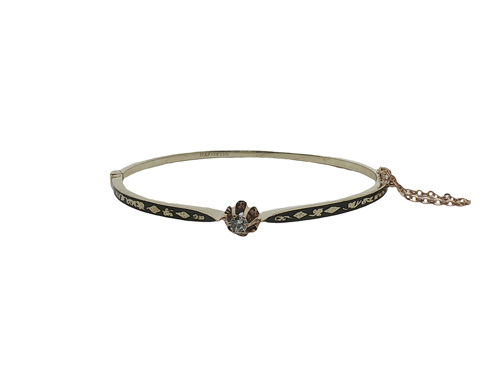 The hinged bangle measures 2.25″ across and features a safety chain.