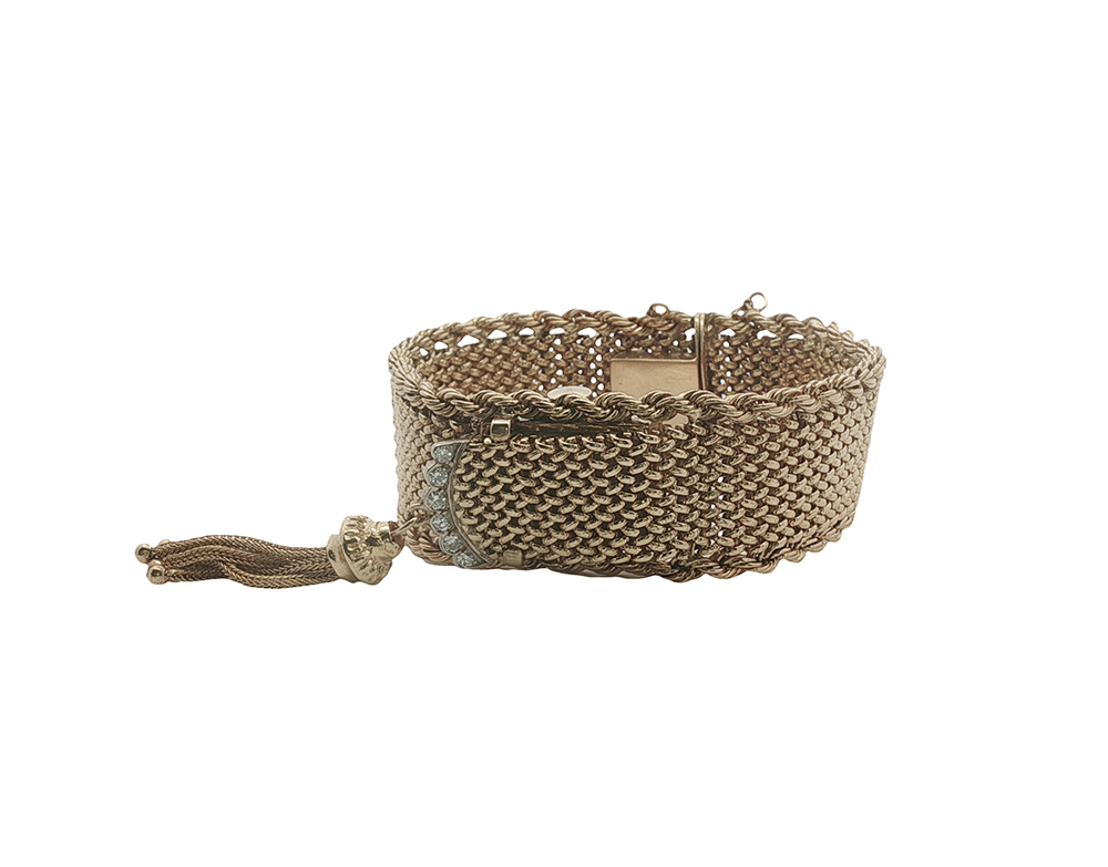 Revel in the frivolity and discreet practicality in this Victorian Revival bracelet. Mid-century in origin, the bracelet features a fun tassel detail, diamond accents, and a hidden timepiece for a one-of-a-kind estate find.