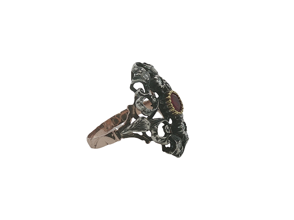 Feel like you’ve stepped onto the moors in Wuthering Heights with this vintage Victorian Revival ring. A ruby set in gold is surrounded by an ornate network of silver vines studded with rose cut diamonds.