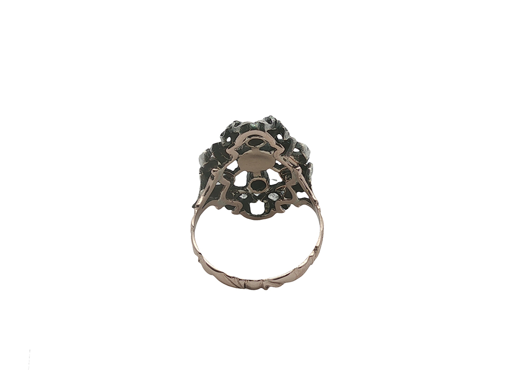 Stone(s): round faceted ruby (approximately 5 mm); rose cut diamonds