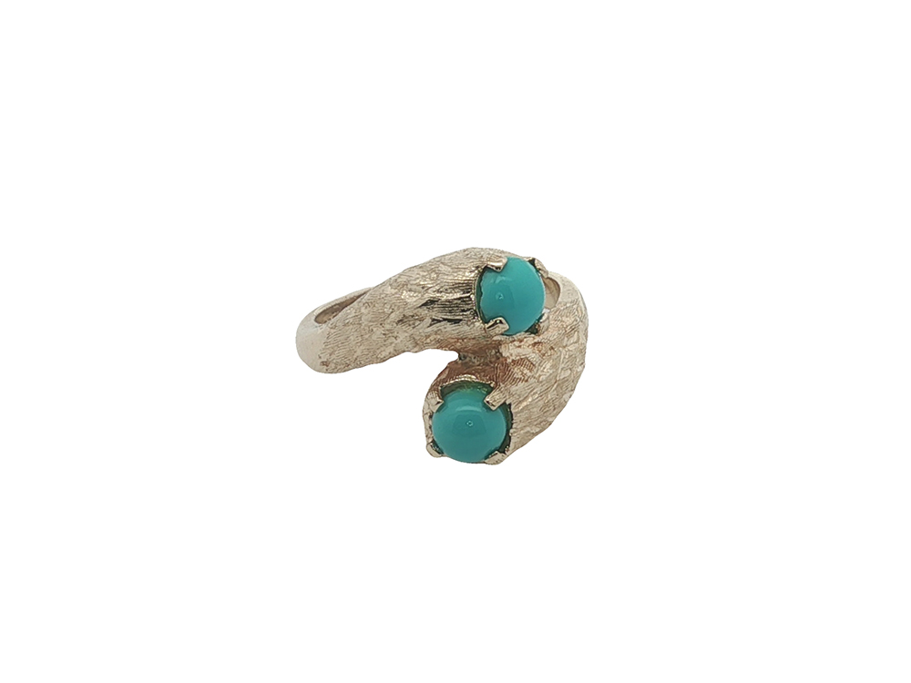 This ring is like a mythical jewelry creature – feathered, gilded and double-headed, this vintage turquoise bauble is a delight!